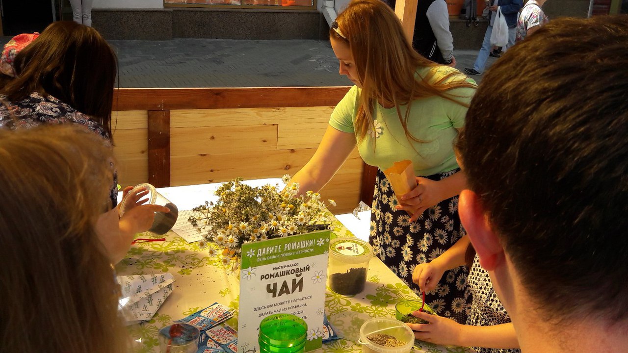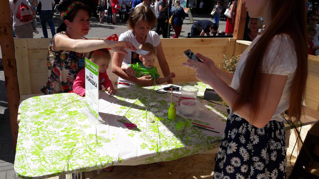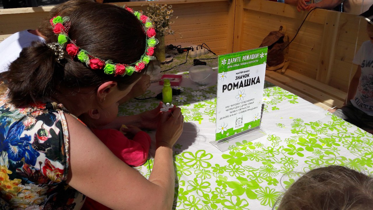 Недалеко от площадки были расположены небольшие шатры, в которых проводились краткие уроки по изготовлению значков-ромашек, ромашковых кораблей, ромашкового чая, а так же кукол-оберегов. Любой мог попробовать смастерить для себя и своей семьи оберег, отпугивающий нечистую силу и защищающий своих домочадцев. Для маленьких детей была организована уютная игровая зона, где можно было покататься на качелях, нанести аквагрим, поучаствовать в творческих мастер-классах.
