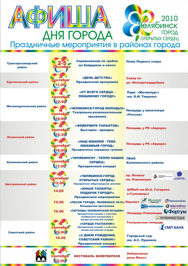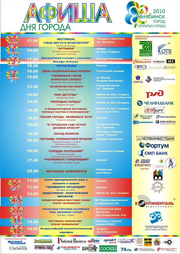 В программе праздника - полюбившиеся челябинцам областной фестиваль творческой молодёжи «Артишок», праздничное шествие, которое соберёт около 16 тысяч участников, Парад моды и Парад колясок, концерты «Её величество опера» и «В городском саду играет духовой оркестр», фестиваль уличных танцев «Челябинск танцующий», большой концерт на пл. Революции, который растянется на два дня, общественно-политический вернисаж и фестиваль фейерверков. Ожидаются среди мероприятий и новинки: фестиваль «Своё место в архитектуре», благотворительная акция «Сердце распахни», гала-концерт первого конкурса «Песня города. Челябинск 2010». Всего только в общегородскую программу праздника вошли более 20 акций. Празднование продолжится до самого дня основания Челябинска - 13 сентября.