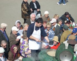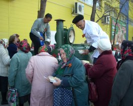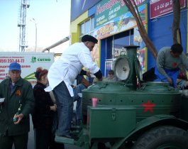 Организаторы акции - руководство рынков - уже имеют опыт в проведении подобного рода мероприятий, но в этом году акция несла более масштабный характер и была адресована непосредственно ветеранам войны и пожилым людям. На рынках была установлена настоящая полевая кухня времен ВОВ, в которой в одном котле готовилась на углях с пылу с жару перловая каша с тушенкой, а в другом - черный сладкий чай.
