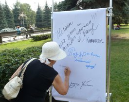«Я в восторге. Недавно приехала в ваш город! К сожалению, не видела все картины, и сегодня постараюсь погулять именно по тем улицам, где они висят. А поздравление Челябинску я напишу на казахском языке». Гузель. г. Астана, - такие отклики оставили в «Палитре поздравлений» челябинцы и гости Челябинска. Временами даже выстраивалась небольшая очередь из желающих оставить свое пожелание в день города.