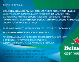 19 мая 2012 года компания HEINEKEN при поддержке телекомпании НТВ + в прямом эфире организует просмотр Финала UEFA Champions League из Мюнхена. В этот вечер Heineken подарит поклонникам своей марки и любителям футбола возможность просмотра трансляции матча на большом экране «КРК Мегаполис», в формате 3D.