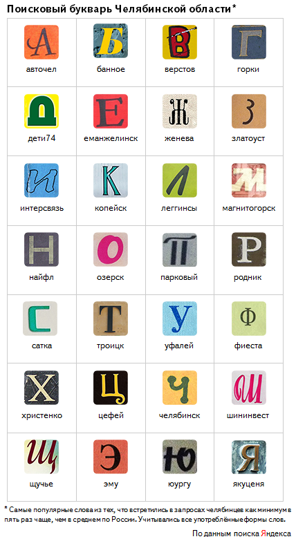 Каждую неделю челябинцы вводят в поисковую строку Яндекса в среднем 68 миллионов слов. Как и жители других регионов, чаще всего в запросах они употребляют слова «онлайн», «скачать», «бесплатно», «смотреть» и «игра». Однако есть такие слова, которые челябинцы используют значительно чаще, чем пользователи из других мест. Такие слова и вошли в наш букварь.