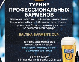 Через несколько месяцев в Сочи начнется зимняя Олимпиада, на которую приедут гости со всего мира. Соревнования будут смотреть на стадионах, вместе с друзьями болеть за любимые команды в спорт-барах по всей стране. Бармены во многих заведениях Урала также будут вовлечены в это грандиозное спортивное событие, ведь именно они будут обслуживать тех болельщиков, которые пришли посмотреть соревнования в их бар. Поэтому в преддверии знаменательного спортивного события компания «Балтика», официальный поставщик Олимпийских зимних игр в Сочи в категории «пиво», проводит общероссийский турнир BALTIKA BARMEN’S CUP, региональный этап которого на Урале состоится в Челябинске. «Балтика» предлагает отобрать лучших из лучших. Не просто барменов, которые ловко обращаются с реквизитом за барной стойкой, а тех знатоков своего дела, кто всегда может найти подход к любому гостю, знает и реализует на рабочем месте принципы культуры ответственного потребления, знает все о своей работе и, конечно, готов отправиться в Сочи, чтобы своими глазами увидеть, как пройдет Олимпиада.