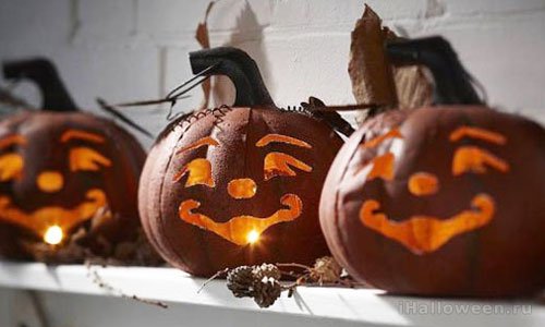 Берем подходящую тыкву и отрезаем аккуратно верхушку. С помощью большой ложки выскабливаем все содержимое из тыквы. Затем рисуем маркером или простой ручкой элементы лица на тыкве и вырезаем их ножом. Таким образом, создаем зловещую рожицу. После этих процедур устанавливаем внутри тыквы небольшую свечку, поджигаем ее и закрываем крышкой саму тыкву. Включайте свою фантазию и создавайте, таким образом, красивые и оригинальные украшения для праздника.