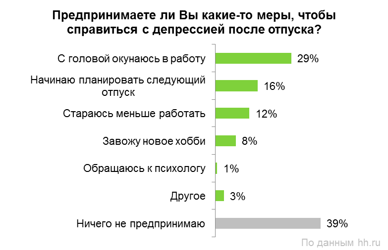 Стоит отметить, что лишь 60% подверженных послеотпускному стрессу сотрудников пытаются справиться с нервным напряжением: каждый четвертый, например, с головой окунается в работу, а 16% в первый же рабочий день приступают к планированию своего следующего отпуска.