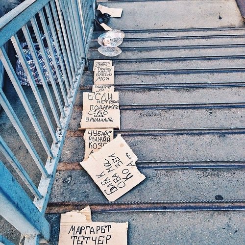 Журналисты уехали и больше не возвращались, но бездомный весельчак не унывает и продолжает креативить – возле него всегда много разных социальных лозунгов на актуальные и довольно злободневные темы, пусть и черным маркером на картонке. Чем богаты, тем и рады, как говорится. Главное ведь – внимание.
