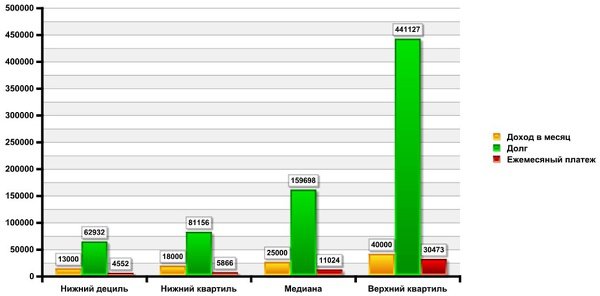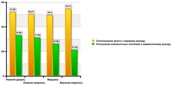 Так, 10% заемщиков с самыми небольшими заработками тратят на обслуживание всех кредитов 33% своих доходов. И, напротив, у заемщиков с высоким достатком на выплату кредиторам уходит только 21% доходов.
