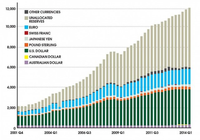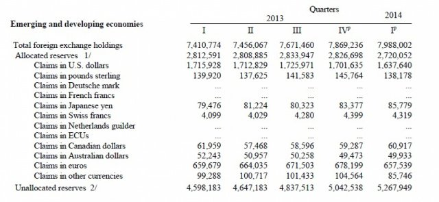 По предварительным данным за IV квартал 2013 г. и I квартал 2014 г. ежеквартального сводного отчета по структуре мировых валютных резервов (Currency Composition of Official Foreign Exchange Reserves, COFER), эта тенденция наиболее заметно прослеживается по развивающимся странам: