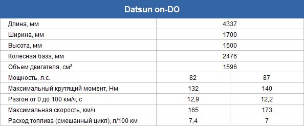 На скорости около 100 км/ч Datsun on-DO начинает ощутимо плыть по дороге. В салоне сильно ощущаются вибрации от дороги, а механическая коробка сводит с ума своим надрывным воем. «Одним словом - ВАЗ», - вердикт готов? Нет, японский седан – это все же простая, без наворотов, но иномарка. Во всем: начиная от резины Pirelli P1 Cinturato и заканчивая ABS, подушкой безопасности, элетроусилителем рули и передними сиденьями с подогревом уже в самой простой комплектации за 329 000 рублей. И это прорыв: сверхпопулярный Logan в похожем оснащении обойдется более чем в 400 000 рублей. Другие бюджетные седаны – еще дороже.