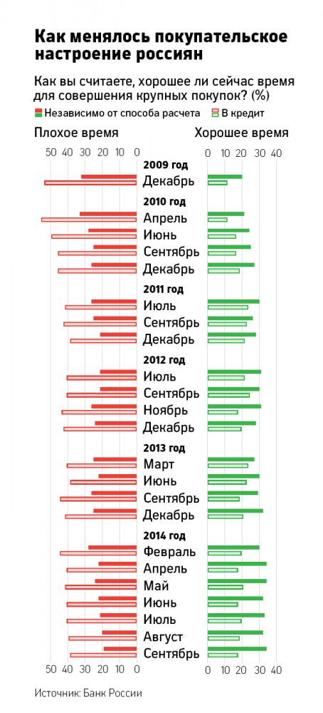 Росстат также уже второй квартал подряд фиксирует максимальные с третьего квартала 2008 года значения индекса благоприятности условий для крупных покупок, следует из обзора потребительских ожиданий в России в третьем квартале 2014 года от 7 октября.