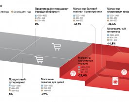 Трафик в крупных торговых центрах Москвы снижался с марта, в конце июня вернулся к показателям 2013 года, но в августе снова ушел в минус, немало огорчив торговцев, рассказывает партнер по исследованиям Watcom Мария Вакатова. В этом году в столице должен быть введен рекордный объем новой торговой недвижимости – около 750 тыс. кв. м (всего будет примерно 5 млн кв. м), но моллы открываются полупустыми. Если в предыдущие годы доля работающих магазинов в открывающихся торгцентрах колебалась в районе 70–80%, то в этом – 60–65%, подсчитала партнер «Магазина Магазинов» Диана Зазнобина.