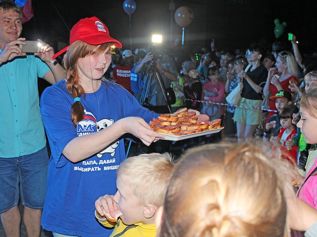 Когда на сцене появилась облаченная во все черное солистка «Комбинации» Татьяна Иванова, ностальгирующая публика пришла в восторг. Вместе с ней троичане подпевали любимые хиты про вишневую девятку, про встречу на Манежной и про бухгалтера. Неожиданно под «Два кусочека колбаски» перед сценой появилась молодежь в футболках и с флагами «медведей». Пока одни радостно размахивали стягами в такт песни, другие раздавали зрителям бутерброды с колбасой. Праздничный ужин порадовал от души: зрители с удовольствием перекусили.