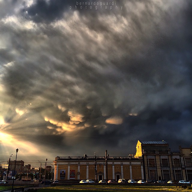 В среду, 10 июня, около 21.00 над Челябинском можно было наблюдать редкий вид облаков, получивших название Асператус. На фото, сделанном напротив театра Оперы и балета, в верхнем левом углу можно заметить, как из туч выстроился глаз.