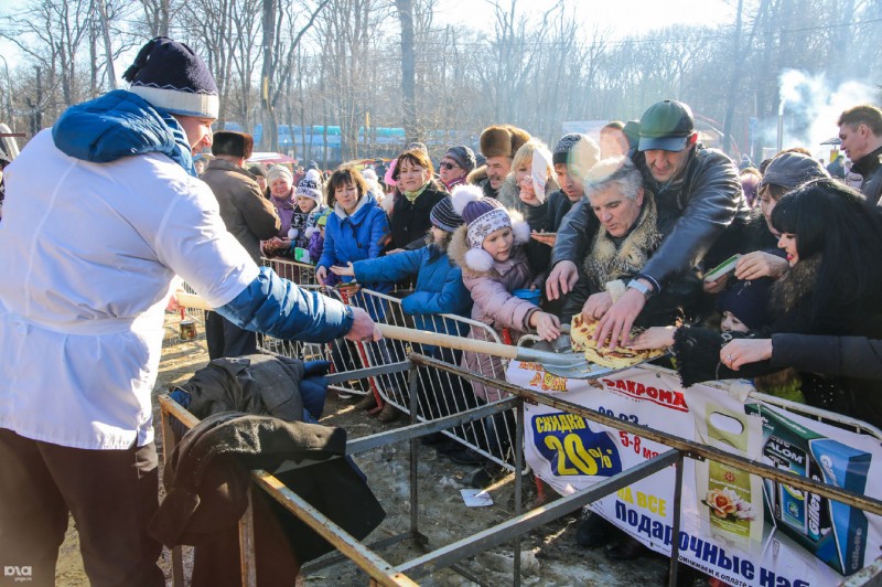 Почему-то люди, когда хотят кусок халявного блина, так толкаются и готовы есть этот блин даже с лопаты! При этом лопата – это уже потолок идиотизма, а толкания, маты и истинное желание ухватить кусок халявы – были всегда! На любом бесплатном мероприятии. Казалось бы, сколько стоит дома испечь десяток блинов? Даже во времена сегодняшнего кризиса это стоит весьма недорого. Да с домашним вареньем! Сядь ты с семьей, попей чайку с блинами, а потом уже сходи подыши морозным воздухом субботнего или воскресного города. Но нет, это была бы не Россия. Посмотрите на фото ниже) Стоит седовласый мужик в кожаной недешевой куртке, хватает с лопаты блин...
