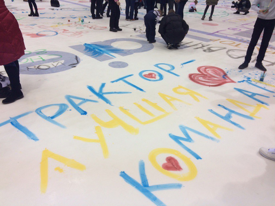Сразу после матча с «Адмиралом» болельщики «Трактора» вышли на лед с кистями и красками, чтобы написать пожелания любимой команде. Гостям ледовой арены дали возможность проявить свою фантазию по случаю завершения последней домашней серии 2016 года и грядущего чемпионата России по фигурному катанию. Еще одним поводом для радости стала победа черно-белых со счетом 4:1.