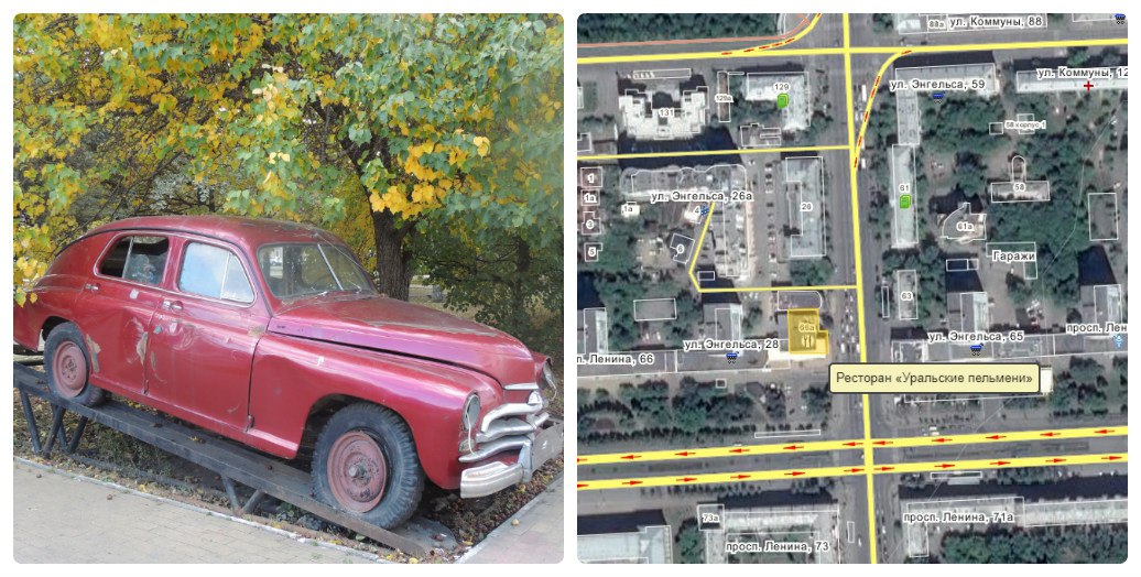 Замечательные осенние фотографии, да еще и в стиле ретро можно сделать возле старенького автомобиля у ресторана "Уральские пельменей" на ул. Энгельса. Представьте, вы в шляпе, очках, перчатках рядом с красным авто 40-50-х годов. Впрочем, и без дополнительных атрибутов получится эффектно.