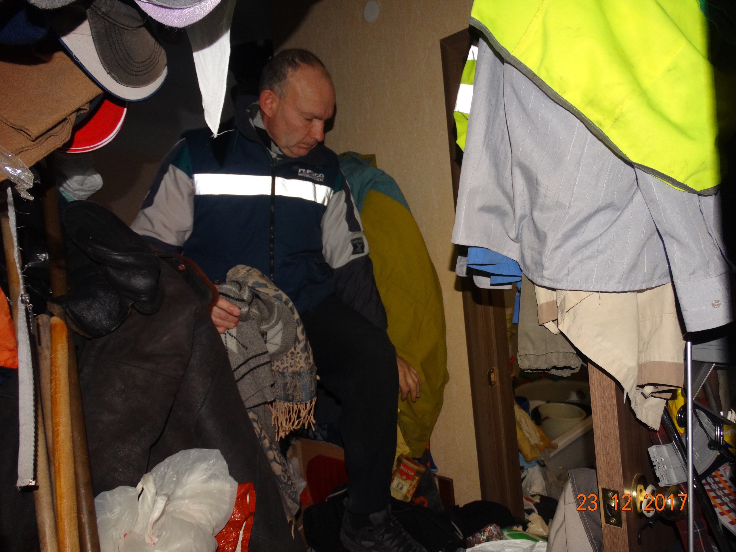 Когда задержанный открыл дверь своей квартиры, чтобы вынести родителям рюкзак, всем стоявшим в подъезде стало видно, что помещения завалены различной одеждой. Вероятно, тоже украденной. Журавлёв, правда, сказал, что находил в мусорных баках. Мужчина вынес рюкзак маленького каратиста, тёплые штаны и кофту.