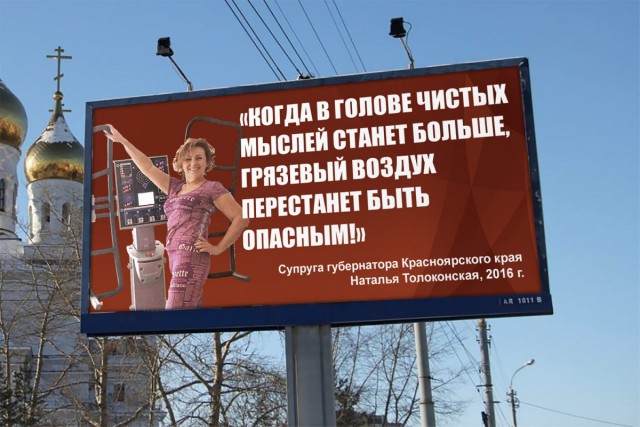 И помните: если вас беспокоит грязный воздух, то вас спасут от него чистые мысли. Так считает жена бывшего губернатора Красноярского края Наталья Толоконская.