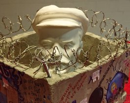 На выставке появились бюсты Ленина в очень оригинальном виде, кто-то изобразил Ленина в грибной шлепке а одна из художников прибыла на выставку из закрытого города и выполнила свою работу в виде Ленина за стеной с колючей проволокой. С ее слов Ленин – это олицетворение их закрытого мира, который не хочет открываться, и за этими стенами образ Ленина не тронут.