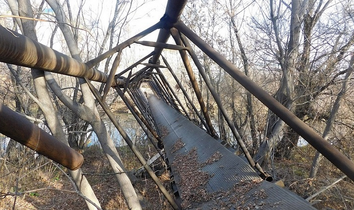 Необычная конструкция, казалось бы, абсолютно бесполезна, но, тем не менее, достаточно примечательная. На навесном мосту точно получаются классные фотки, а теперь его подпилили. Явно орудовали болгаркой. Мостик завалился на бок.