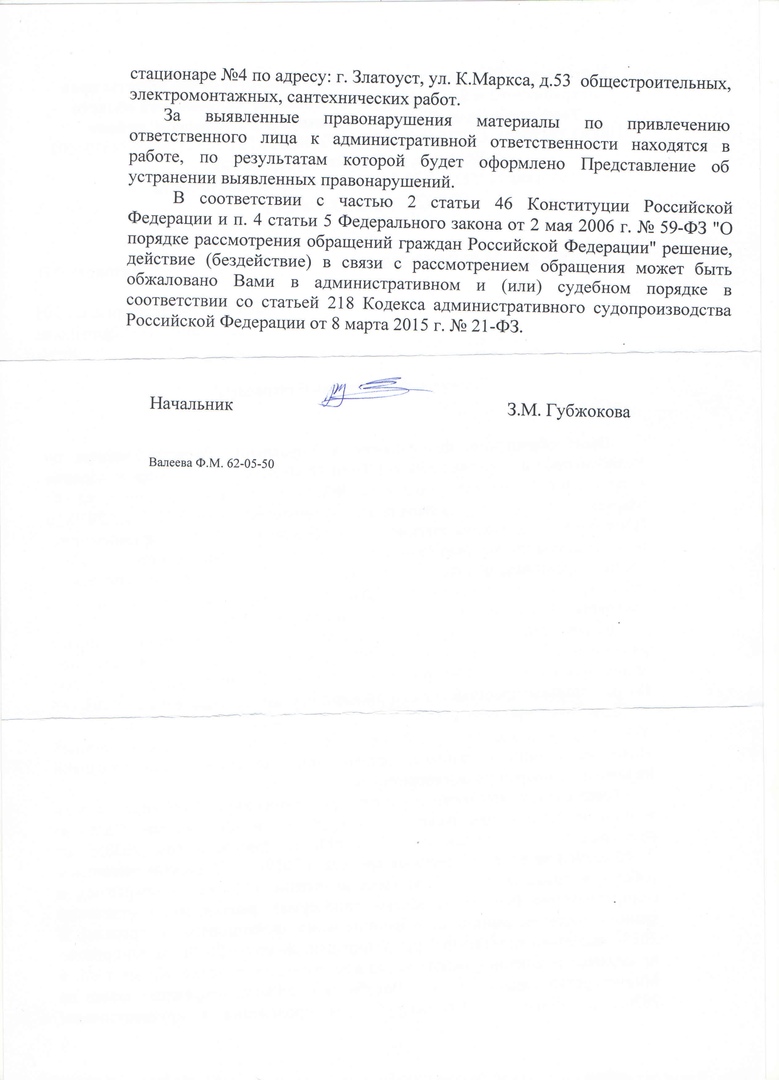 Персонал больницы попытался помешать общественникам, угрожая вызвать главврача. «Гражданский патруль» обратился с жалобой в Минздрав и Роспотребнадзор Челябинской области с просьбой провести проверку соответствия условий в городской больнице №2 города Златоуста с нормами СанПиН. Роспотребнадзор претензии общественников признал, но лишь частично.