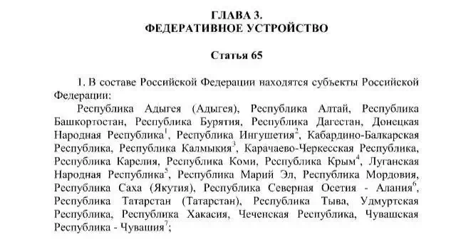 В 2014 году статья 65 была дополнена Республикой Крым. Полуостров вошел в состав России после референдума, в ходе которого жители большинством голосов поддержали присоединение к РФ.