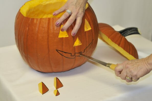 Вам понадобится тонкий острый нож. Загоняйте его в поверхность тыквы под прямым углом, так будет проще. Вырежьте лицо Джека по линиям, которые вы нарисовали. Будьте аккуратны, занятие это не такое простое, как кажется, а нож, все-таки, острый предмет.