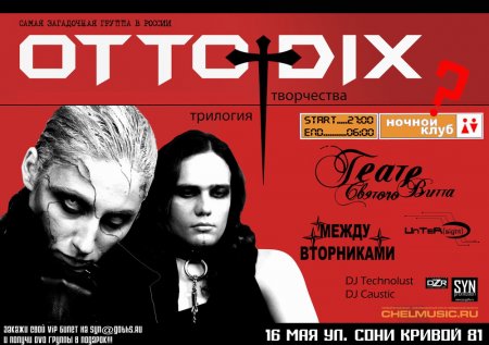 В эту ночь тебя будут ждать великолепные OTTO DIX со своей новой уникальной концертной программой. Но не они одни. Мы приготовили целый взрывной коктейль исполнителей. Это "Между Вторниками" - романтичный синти-рок, это "Театр Святого Витта" - Екатеринбургские гости, играющие декаданс-индастриал, это "UnTeR[sight]" - первые герои Челябинской индустриальной сцены, это готик-индустриальные диджеи - Dj Caustic и Dj TechnoLust, которые зажгут танцпол своими ураганными сетами.