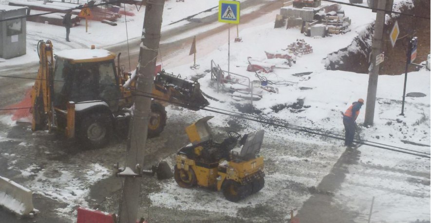 Челябинские дорожники настолько ответственные, что даже снег не мешает им укладывать асфальт.